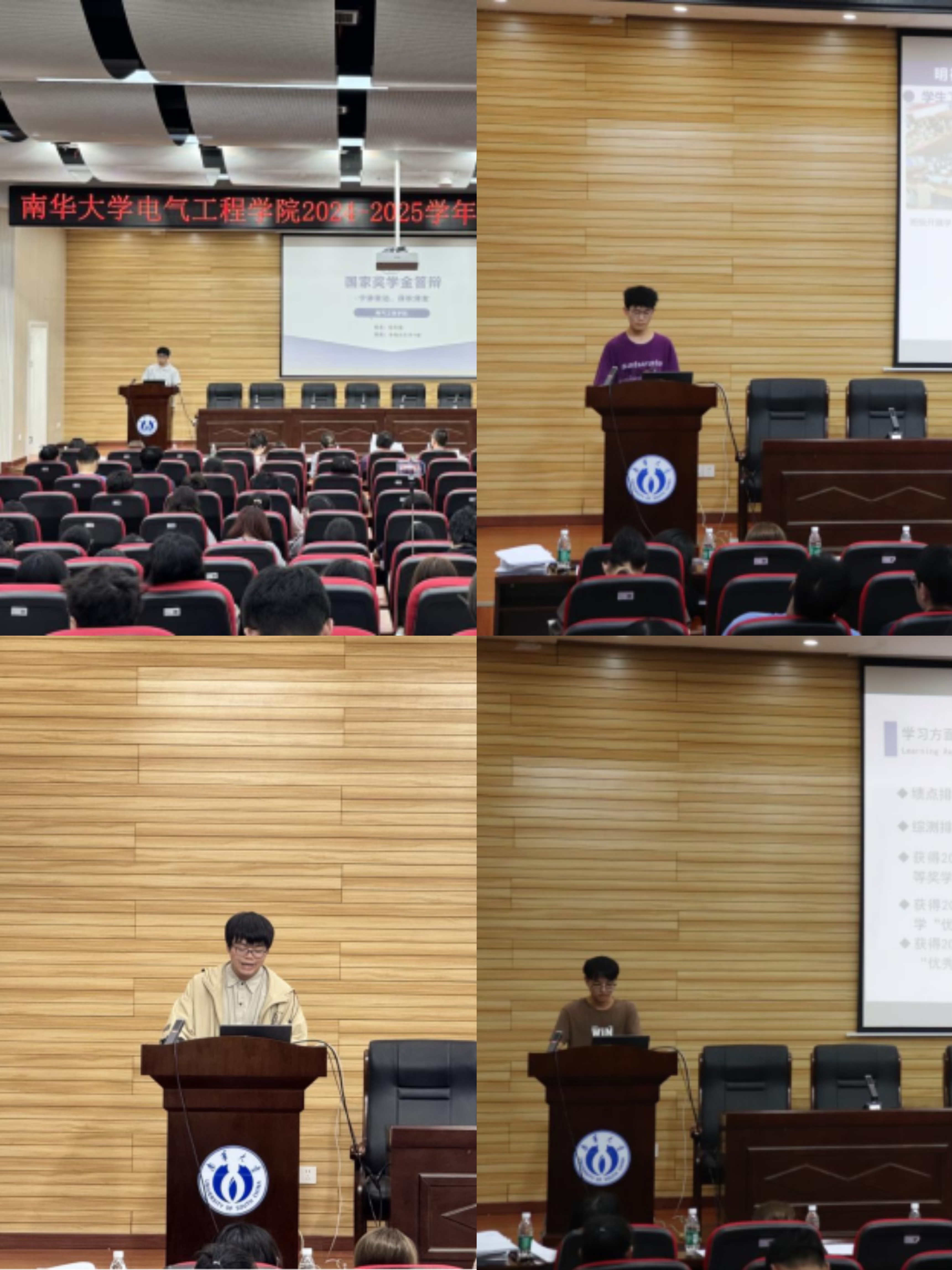 随后,来自不同专业的14名国奖候选人依次上台进行答辩展示。答辩分为个人陈述和评委提问两个环节。在陈述环节,同学们沉着自信、风采卓然,围绕学业成绩、科研竞赛、志愿服务等多个方面,全面展示了电气学子扎实的专业素养和积极向上的精神风貌。他们当中,既有扎根员工工作、热心服务师生的员工骨干,也有专注科研创新、屡获佳绩的学术新锐,还有积极投身社会实践、传递正能量的志愿先锋。在提问环节,候选人针对评委提出的专业领域与个人发展相关问题,思路清晰、对答从容,现场气氛热烈、秩序井然。