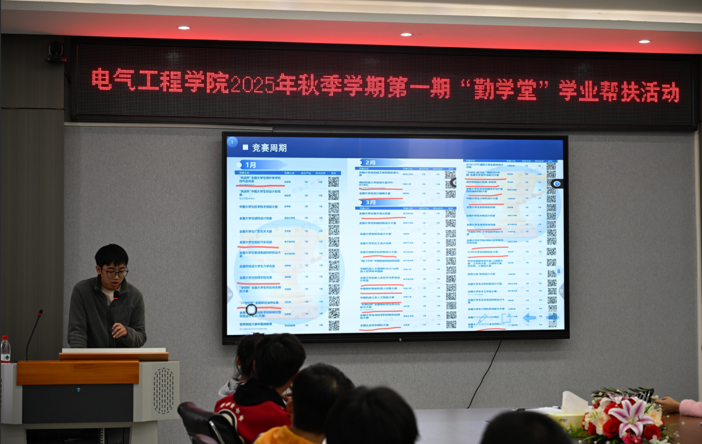 在分享中,任天扬结合自身经验,为同学们系统梳理了大学各阶段的学习重点,强调自律意识和课堂主动性的重要性。针对竞赛规划,他详细介绍了多项专业相关赛事,特别指出电赛在电气工程学习中的关键作用,并精心制作“竞赛周期表”,帮助同学们清晰把握参赛节奏与方向。